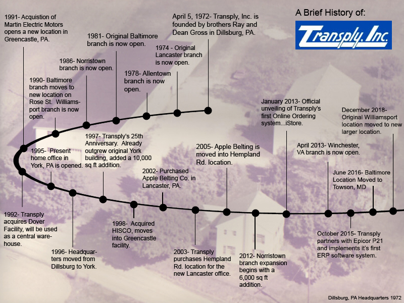 Transply, Inc. has grown from one small office in Dillsburg, PA to six locations in Pennsylvania, one in Maryland and one in Virginia. As well as a sales office, each of the locations has a well stocked warehouse of power transmission and material handling products. A team of inside sales personnel handle the incoming phone calls from customers, while the outside sales team handles the customer’s on-site needs.