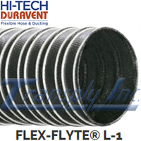 Flex-Flyte L-1 Hose. Size: 3". Length: 12'. Construction: Two-Ply Neoprene Coated Fiberglass. Color: Black. Temp Range: -65°F to 300°F. Applications: Hot Air For Pellet Drying. Not Recommended For Continuous Flexing, Liquids or Abrasives.
