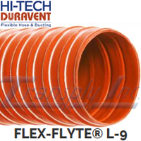 Flex-Flyte L-9 Hose. Size: 1-3/4". Length: 12'. Two-Ply Silicone Coated Fiberglass, Helically Wound Spring Wire Imbedded Between Two Plies. Color: Brick Red. Temp Range: -75°F to 500°F. Applications: Hot Air For Pellet Drying. UV/Weather Resistant.
