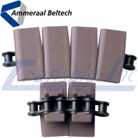 The side flexing uni 1843 Snap-On chain is designed with overlapping plastic flights assembled on a special roller chain with extended pins. Chain Pitch: 1/2".