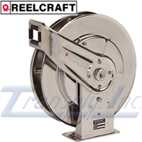 Spring Retractable Stainless Steel Hose Reel For Low Pressure Air/Water/Oil. Hose ID:1/2". Hose OD: 3/4". Holds 50' Of Hose. Pressure:500psi. Inlet:1/2" NPT(F). Reel Outlet:1/2" NPT(F). HOSE NOT INCLUDED. Max Temp.:210°F. For Food Processing, Wash-Down.