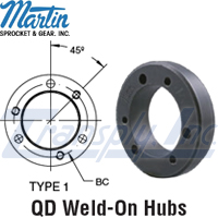 QD Weld-On Hub. Suitable For Many Applications, Like Welding To Plate Steel Sprockets. QD Weld On Hubs Are Made of Steel, Drilled, Tapped and Taper Bored For QD Bushings. Standard or Reverse Mount. OD: 6-1/4". LTB: 1-5/8". Bolt Hole Centers: 5".
