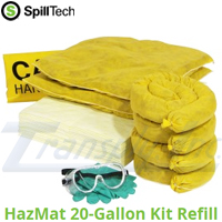 HazMat 20 Gallon Kit Refill. Absorbs: 17.1 Gal. Per Package. Incinerable. This Is The Contents Only To Refill Your HazMat 20 Gallon Spill Kit. Includes Variety of Sizes To Handle Different Spills From Acids, Bases, Solvents and Chemicals.