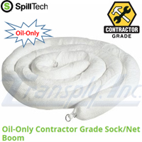 Oil Only Contractor Grade Sock/Net Boom. Color: White/Speckled. Composition: PolyBlend Filler, Polyester Netting, Metal Hardware. Absorbs: 7.5 Gal. Per Boom. 100% Post-Industrial Recycled Poly Blend Filler. 4 Booms/Package. Size: 5"Dia. x 10'(L).