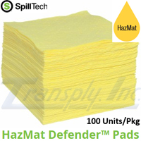 HazMat Defender Pad. Color: Yellow. Composition: Polypropylene. Absorbs: 37.25oz. Per Pad. Economical Choice For Quick Spills of Hazardous or Unknown Liquids. Chemically Compatible w/ Most Liquids. Size: 15"(W)x19"(L). 100 Pads/Package. HeavyWeight.